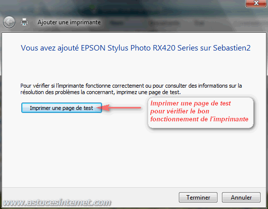 Vous avez la possibilité de tester le bon fonctionnement de votre imprimante en imprimant une page de test. Pour effectuer le test, cliquez sur Imprimer une page de test.