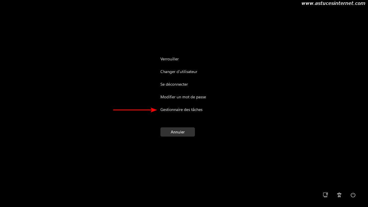 Dans le cas où ça ne fonctionnerait pas, redémarrez votre ordinateur. Il est possible de redémarrer l’ordinateur sans avoir accès au menu Démarrer. Dans la fenêtre qui apparaît avec Ctrl + Alt + Suppr, vous disposez d’un bouton de redémarrage.