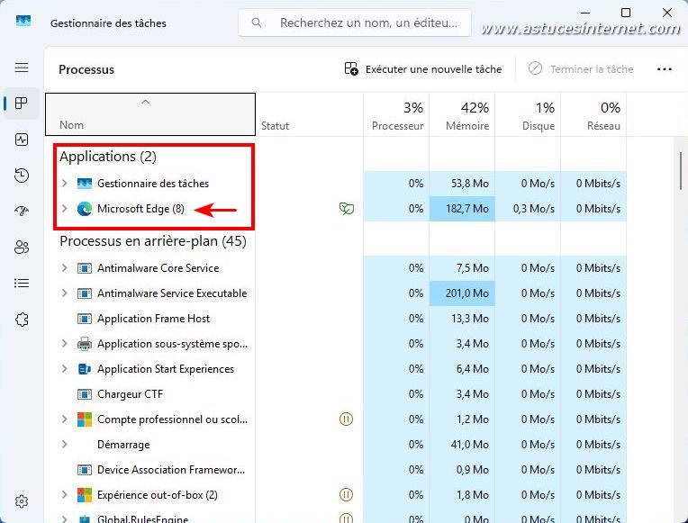 Le gestionnaire des tâches va s’ouvrir. Dans la fenêtre, au niveau des applications, recherchez votre navigateur internet (dans notre exemple, il s’agit de Microsoft Edge mais cela pourrait être Firefox, Chrome ou un autre).