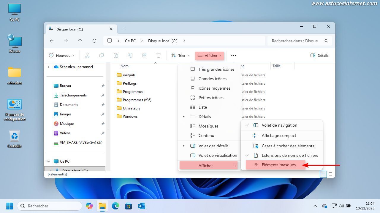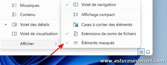 Dans la barre de menu, ouvrez le menu Afficher puis cliquez sur Afficher > Eléments masqués.
