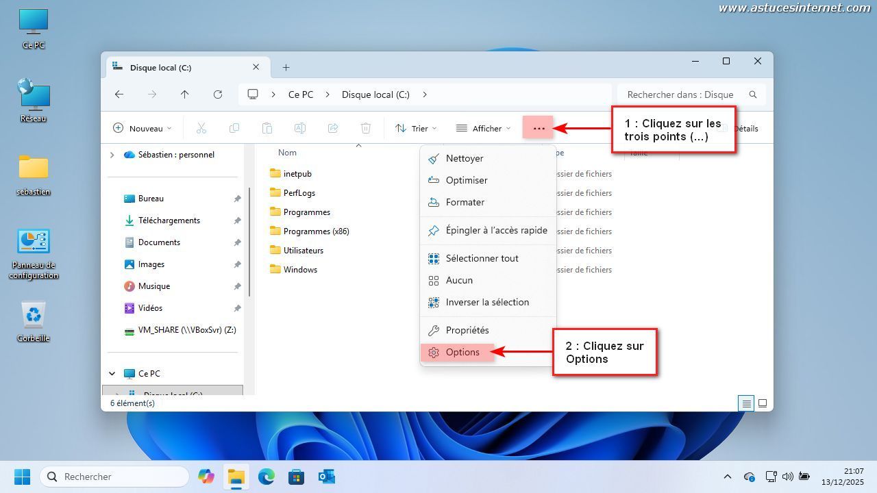 Il existe une solution alternative pour afficher les fichiers et dossiers cachés. Dans l’explorateur de fichiers, il faut cliquer sur les trois points (…) puis sur Options.