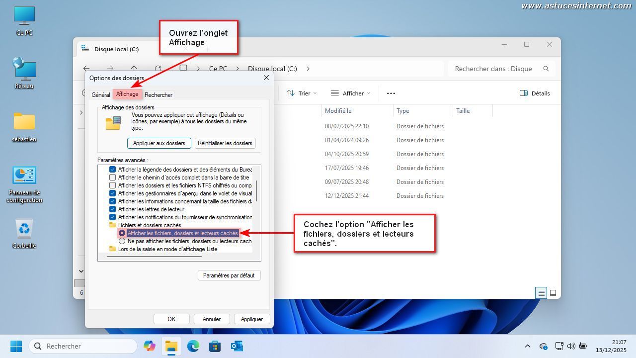 Dans la fenêtre qui va s’ouvrir, placez-vous dans l’onglet Affichage et cochez l’option Afficher les fichiers, dossiers et lecteurs cachés.