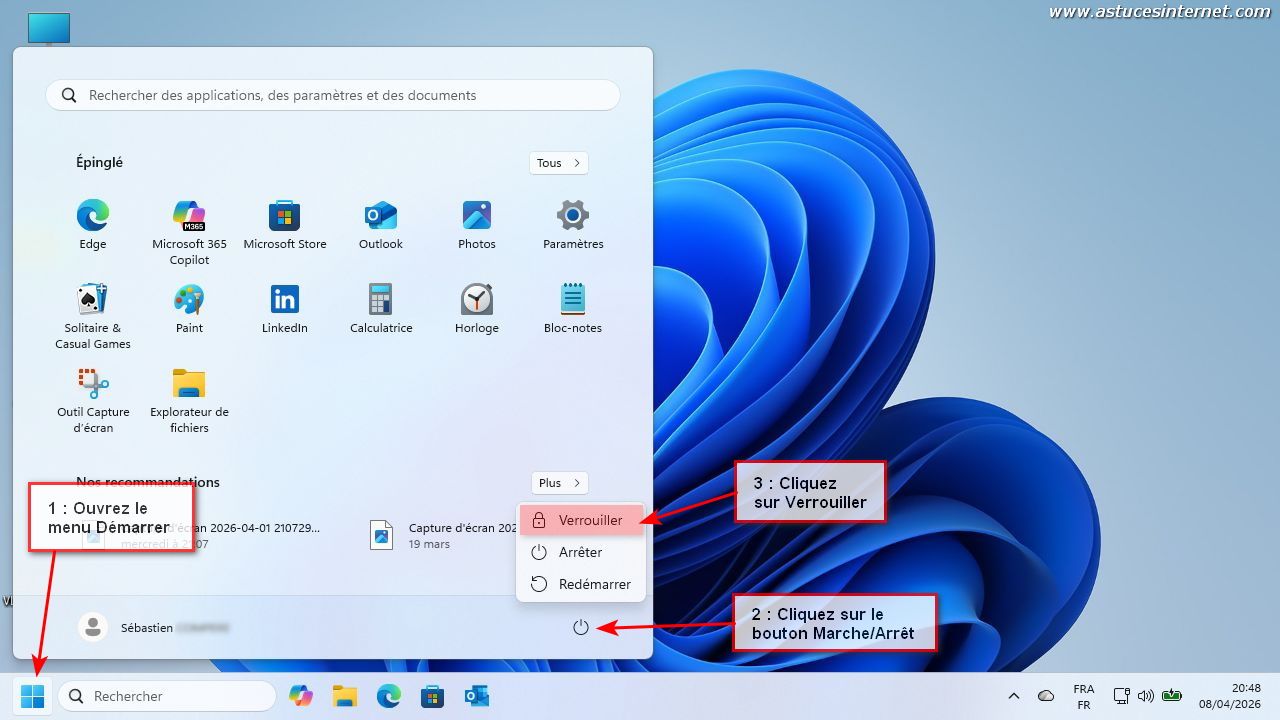 Sur votre clavier, appuyez sur la touche Windows et maintenez-la enfoncée. Appuyez ensuite sur la touche L. La commande sera lancée lorsque vous aurez appuyé sur cette dernière.