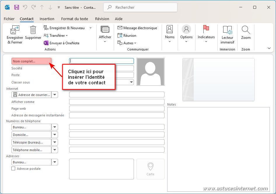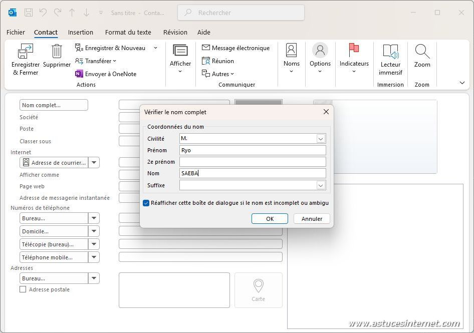 Cliquez sur le bouton Nom complet pour disposer d’une fenêtre facilitant la saisie de l’identité du contact.