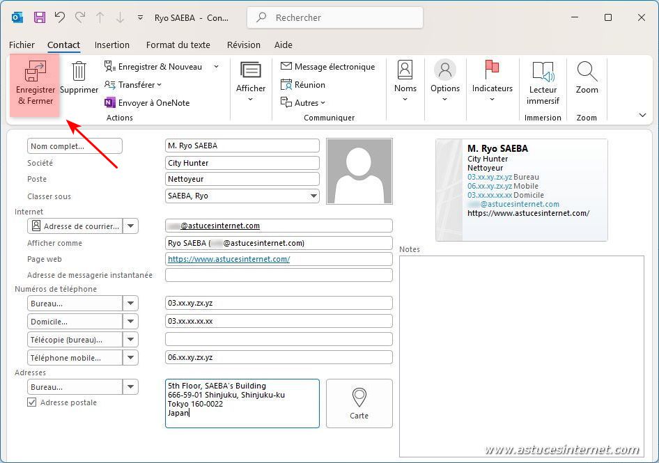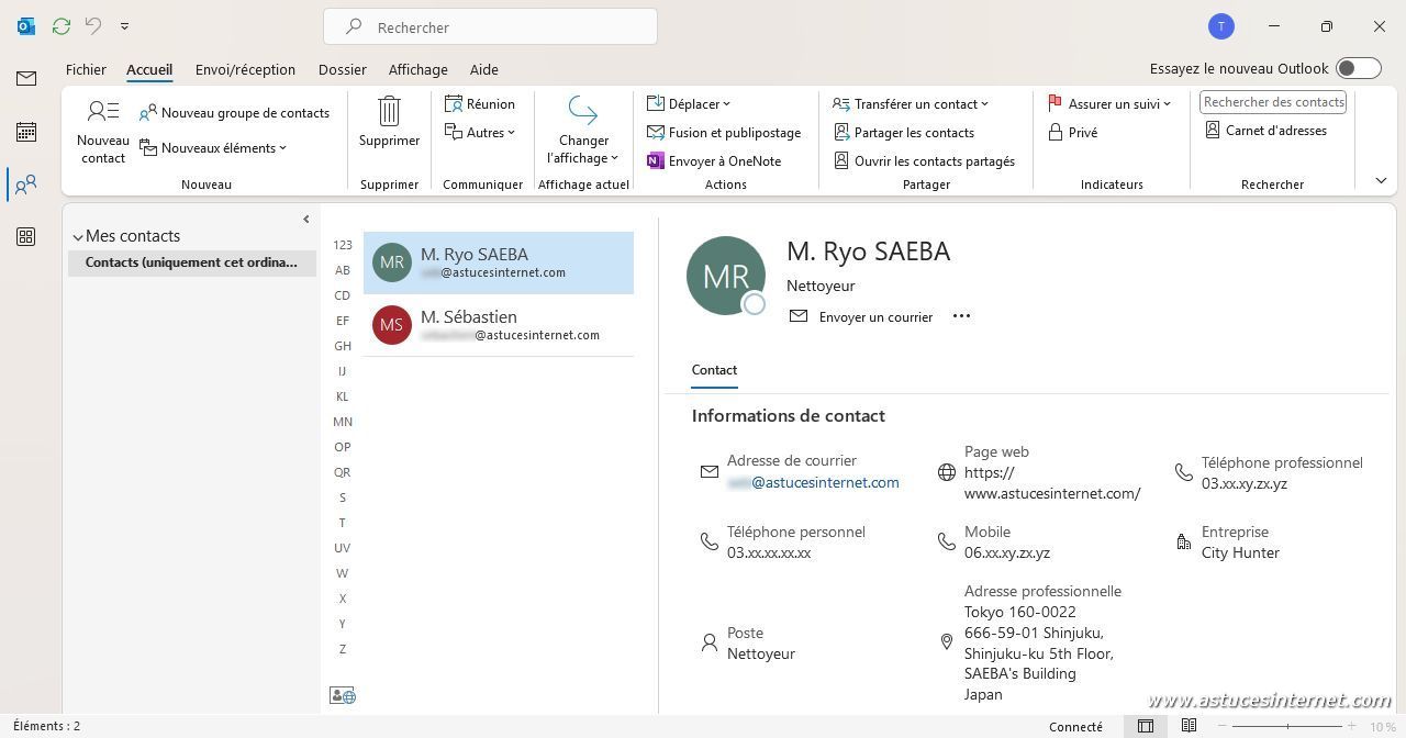 Le contact a été ajouté à la liste des contacts d’Outlook.