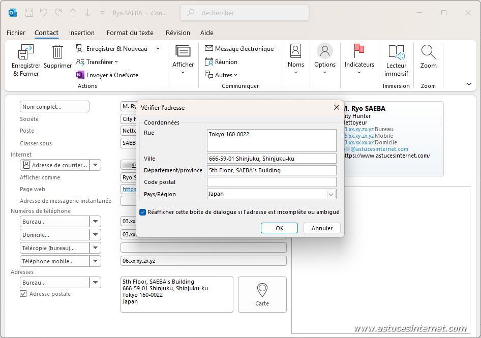 Il est possible qu’Outlook vous demande de vérifier l’adresse. Complétez les informations si possible, et cliquez sur OK pour finaliser l’enregistrement.