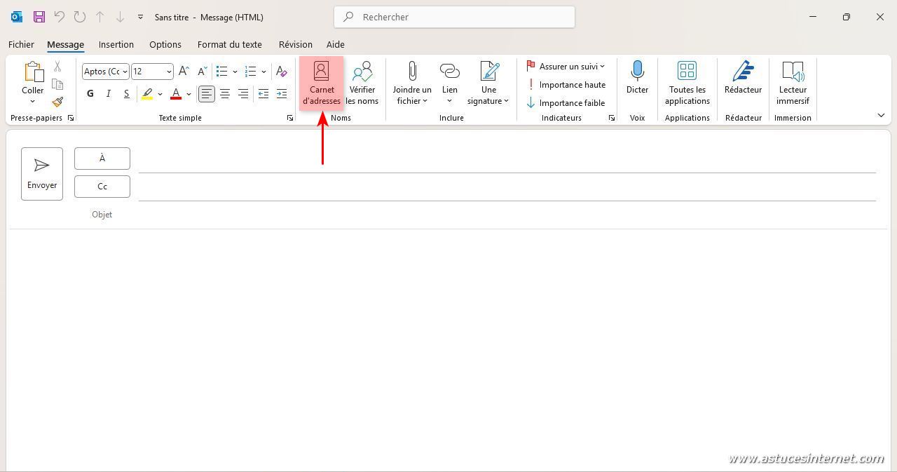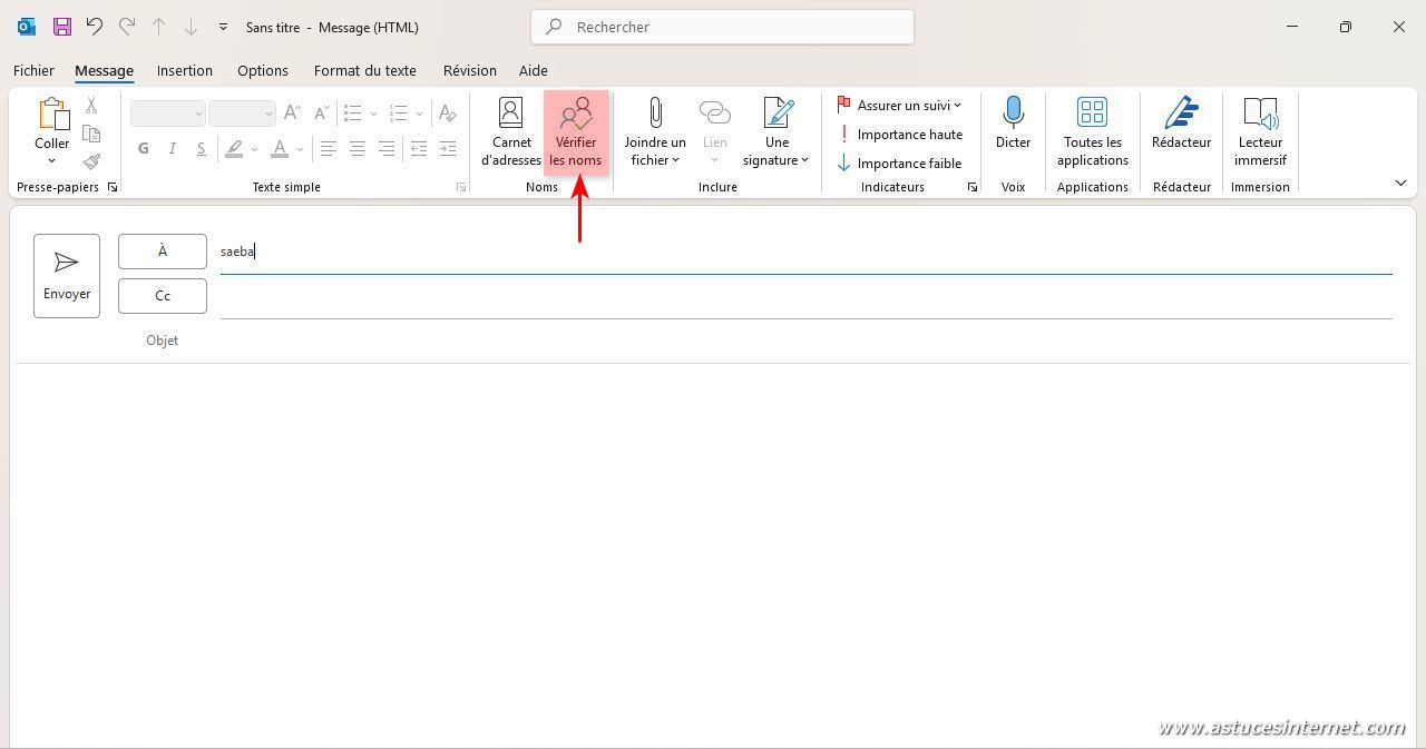 Dans la fenêtre de saisie d’un message, vous pouvez taper un nom dans le champ À (destinataire). Cliquez ensuite sur Vérifier les noms et Outlook ajoutera automatiquement le mail s’il retrouve le contact.