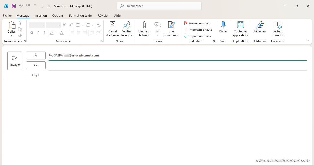 Maintenant que la fiche de contact a été ajoutée dans Outlook, elle peut être utilisée lors de la rédaction d’un message.