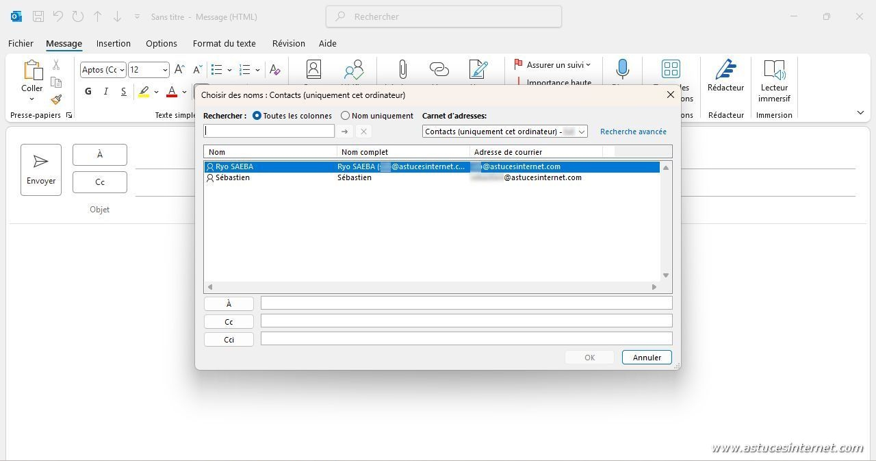 Dans le carnet d’adresse, sélectionnez le contact, placez-le dans le champ souhaité (À, Cc ou Cci) puis cliquez sur OK.