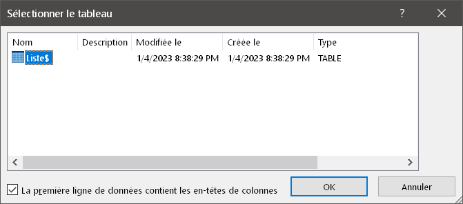 Sélectionnez la feuille contenant votre base de données (Feuille Liste dans notre exemple), cochez la case La première ligne de données contient les en-têtes de colonnes et validez le tout en cliquant sur OK.