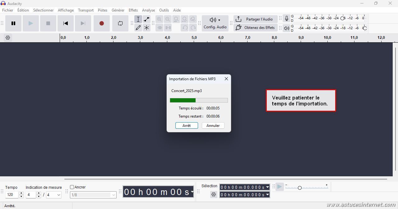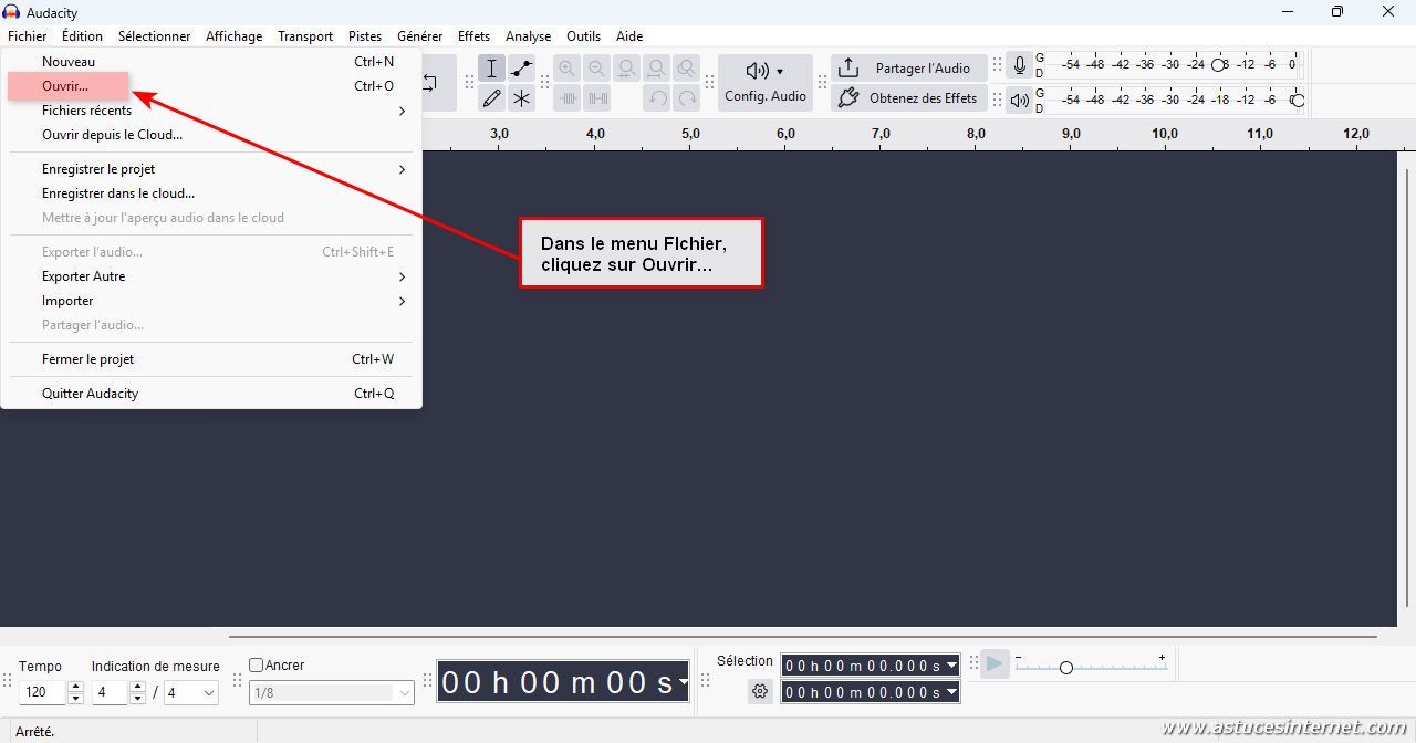 Pour modifier un fichier audio, il faut l’importer dans Audacity. Dans la barre de menu, cliquez sur Fichier puis sur Ouvrir…