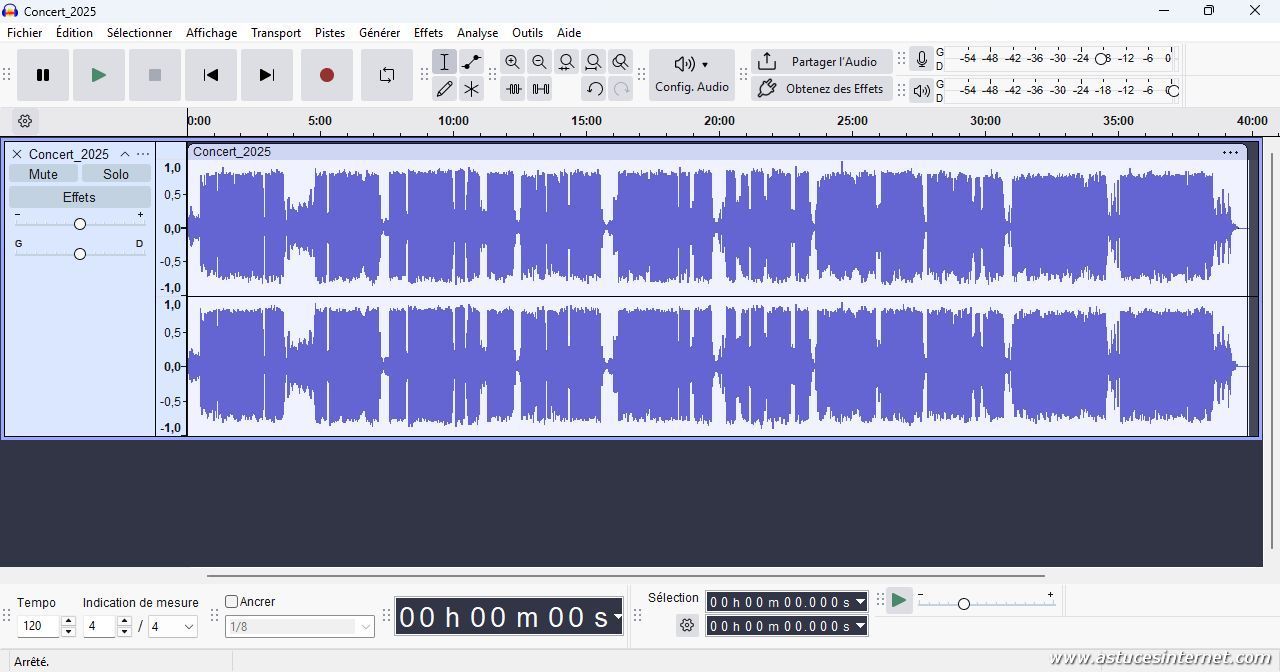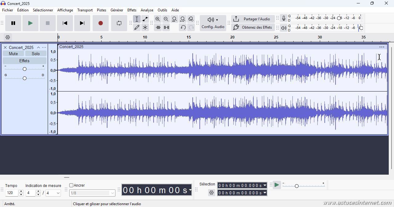 Le fichier est désormais importé dans Audacity. Vous pourrez voir les pistes audios dans l’interface.