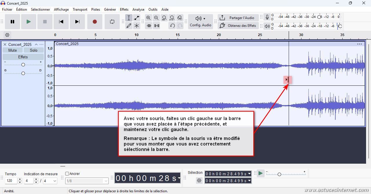 Ajustez le zoom si nécessaire. Nous allons supprimer la partie se trouvant avant le curseur. Placez le curseur de votre souris sur la barre que vous avez positionné dans le spectre audio. S’il est au bon endroit, le curseur de votre souris sera modifié (un triangle pointant vers une barre verticale).