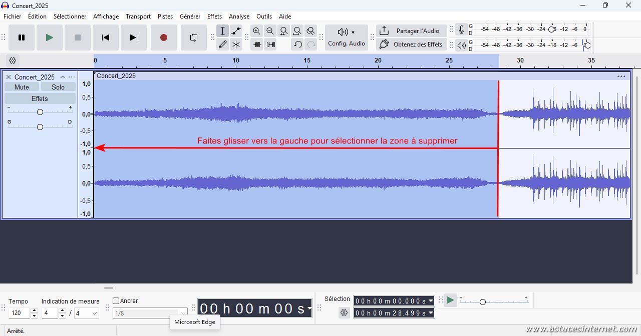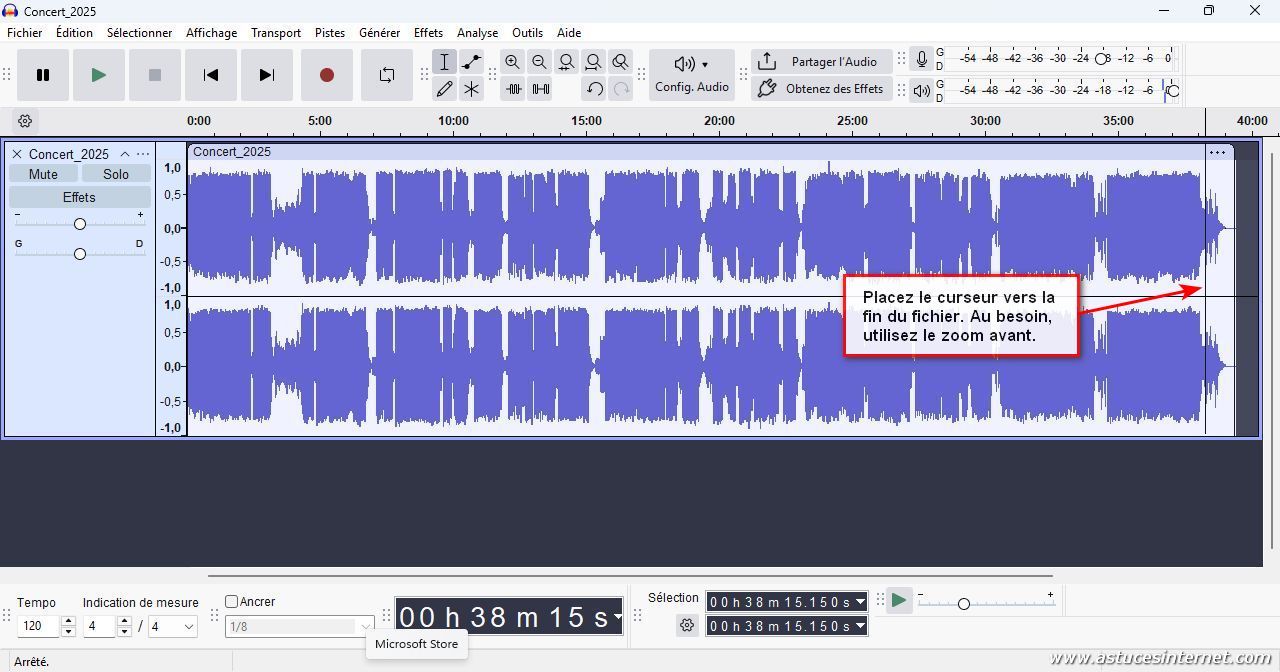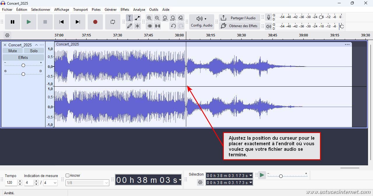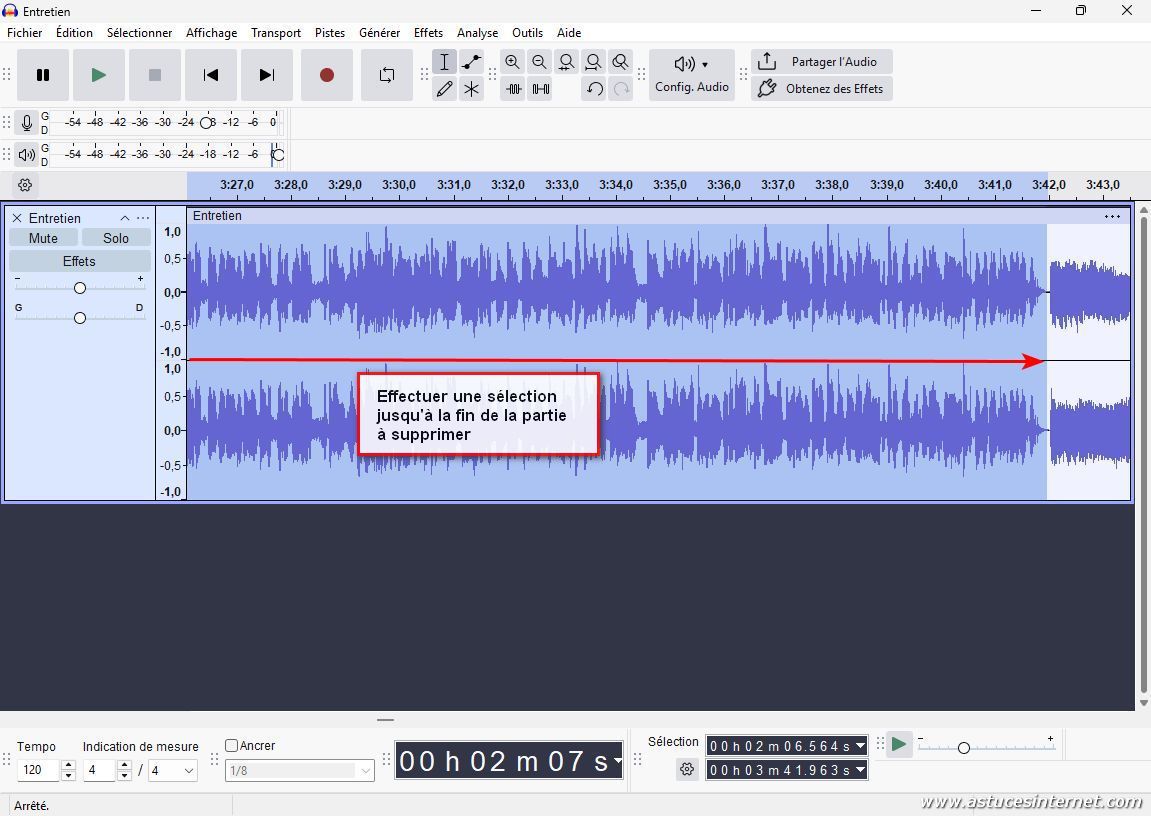 Nous allons maintenant supprimer une partie se trouvant à la fin de notre fichier audio. La procédure va être similaire à celle que nous venons d’observer.