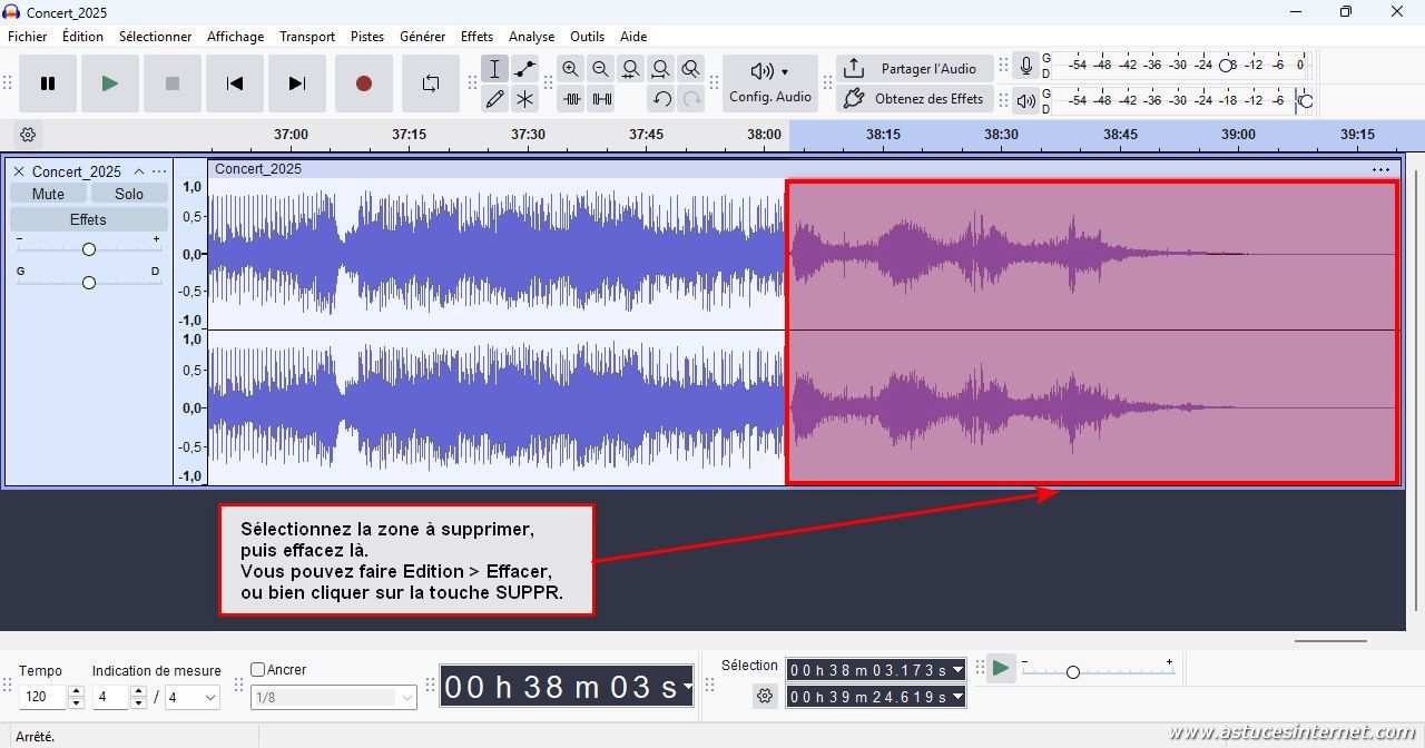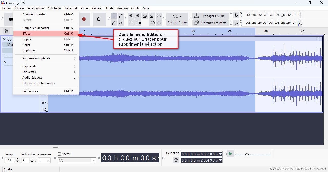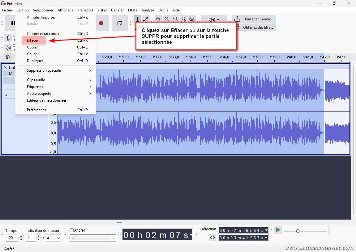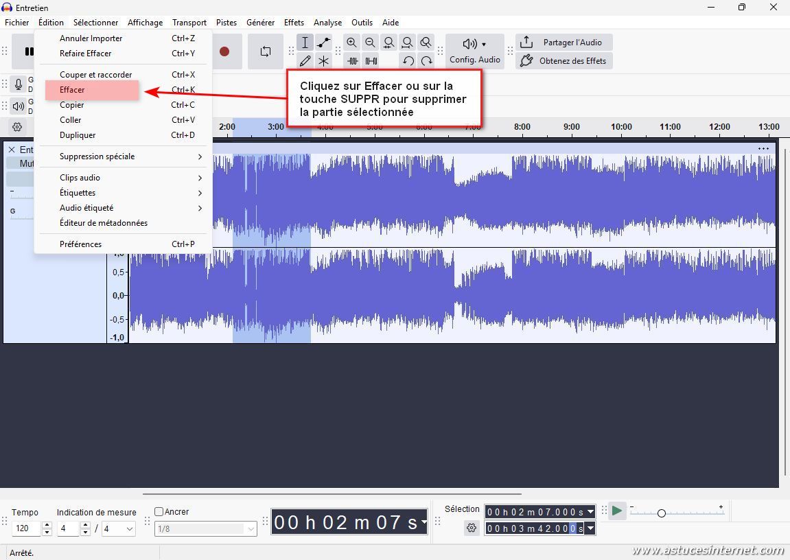 Pour supprimer la partie sélectionnée, dans la barre de menu, cliquez sur Edition, puis Effacer.