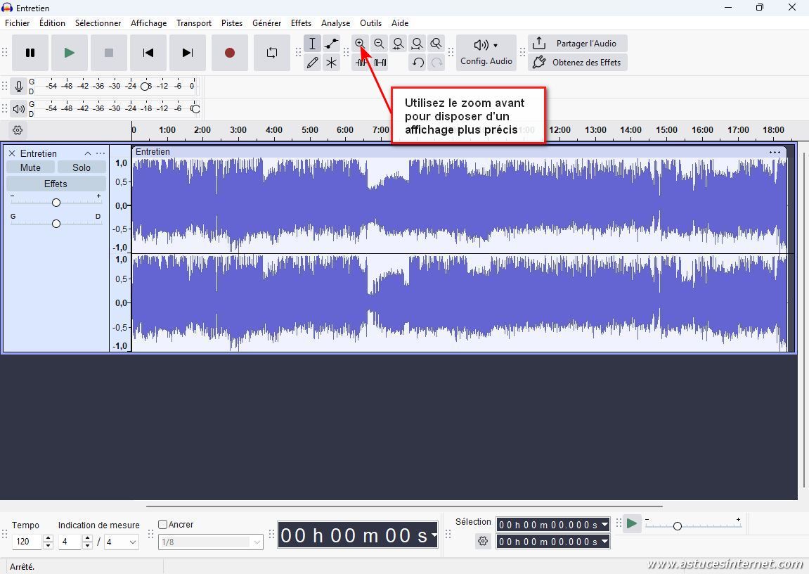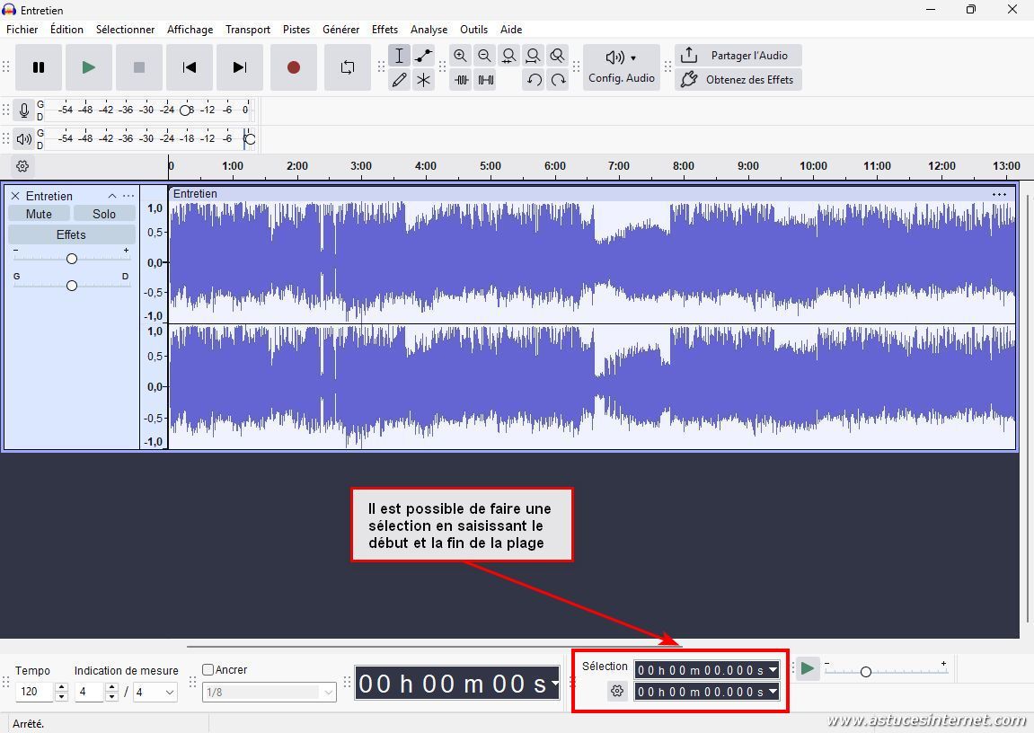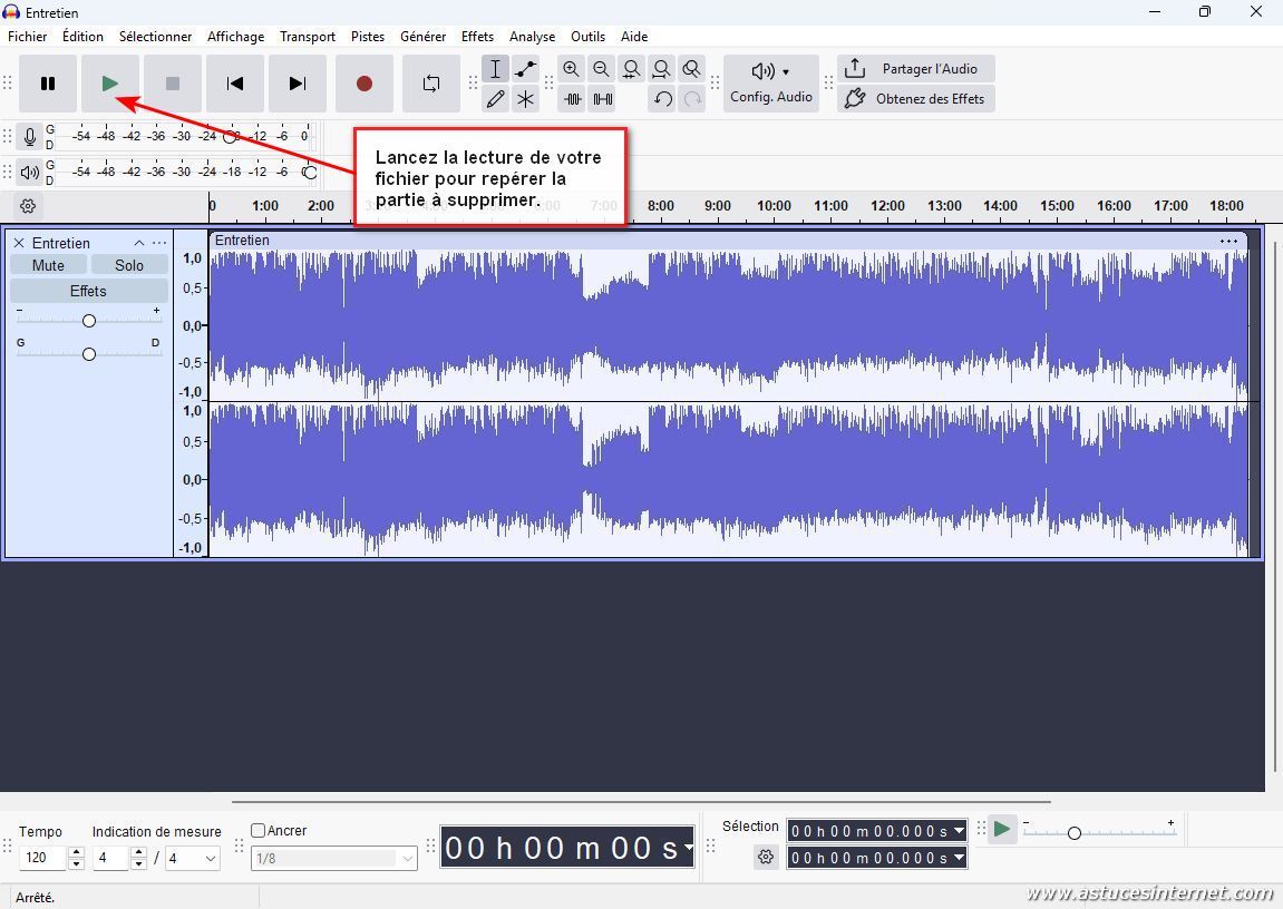 Afin de repérer la plage à supprimer, vous pouvez utiliser la fonction de lecture d’Audacity et repérer le début et la fin.