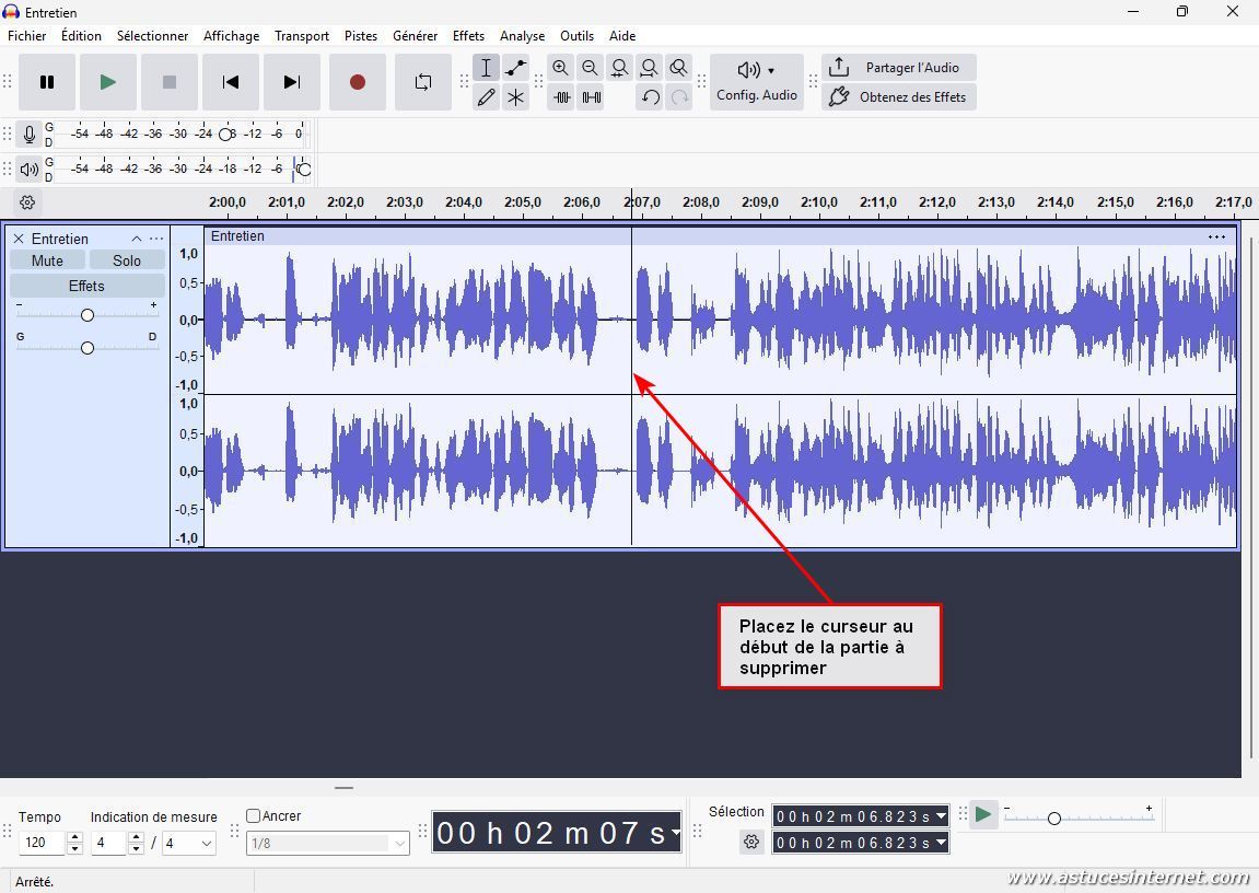 Nous avons zoomé jusqu’à disposer d’une échelle indiquant les minutes et les secondes de notre fichier audio. Après avoir écouté notre fichier audio, nous avons repéré que le début de la plage à supprimer se situe à peu prêt à 2 min et 7sec et qu’elle se termine à 3 min et 42 sec. Placez le curseur à 2 min 7 sec avec votre souris en cliquant dans le spectre musical.