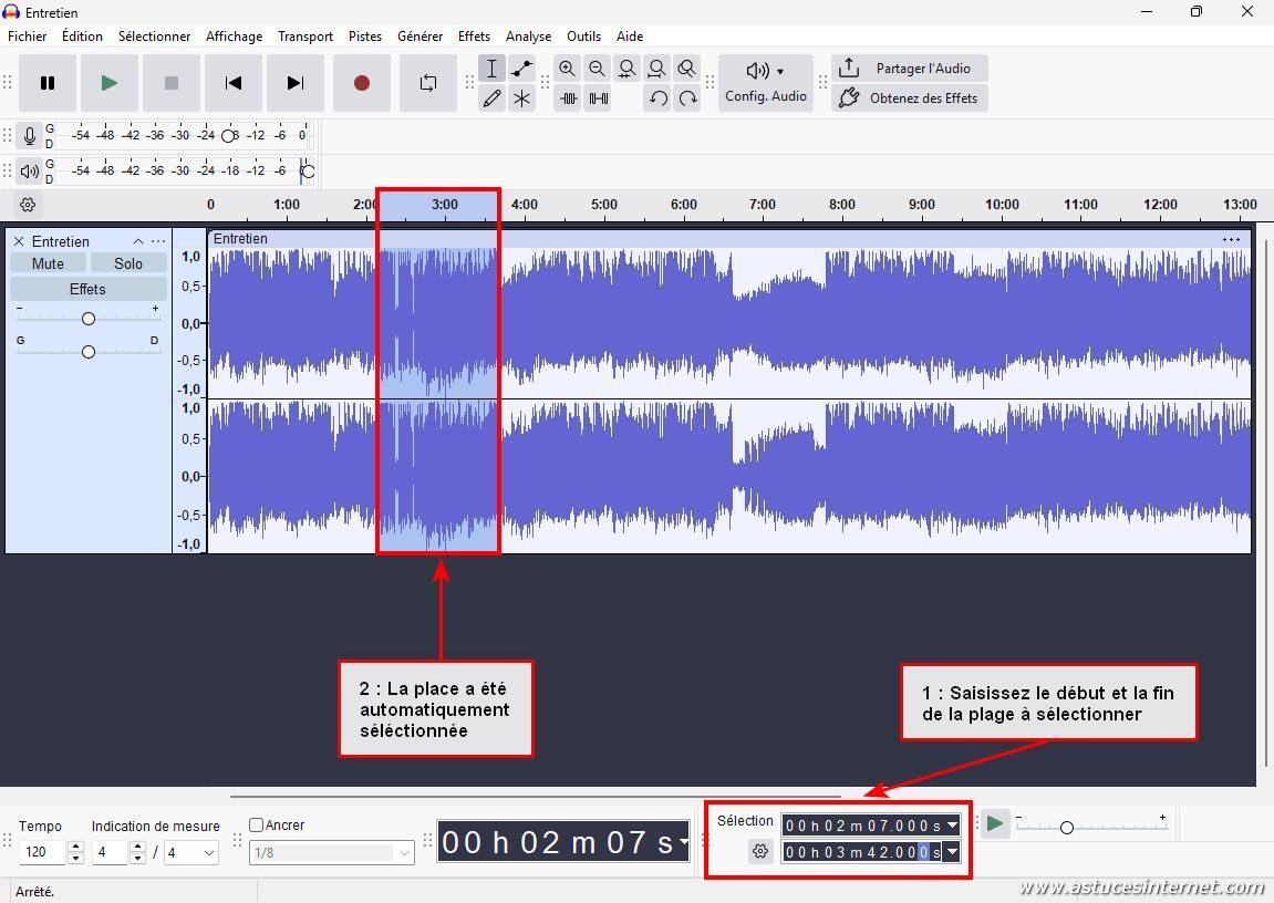 Saisissez le début et la fin de la plage que vous souhaitez sélectionner pour suppression. Dans notre exemple, nous saisissons 2 min 7 sec pour le début et 3 min 42 sec pour la fin.