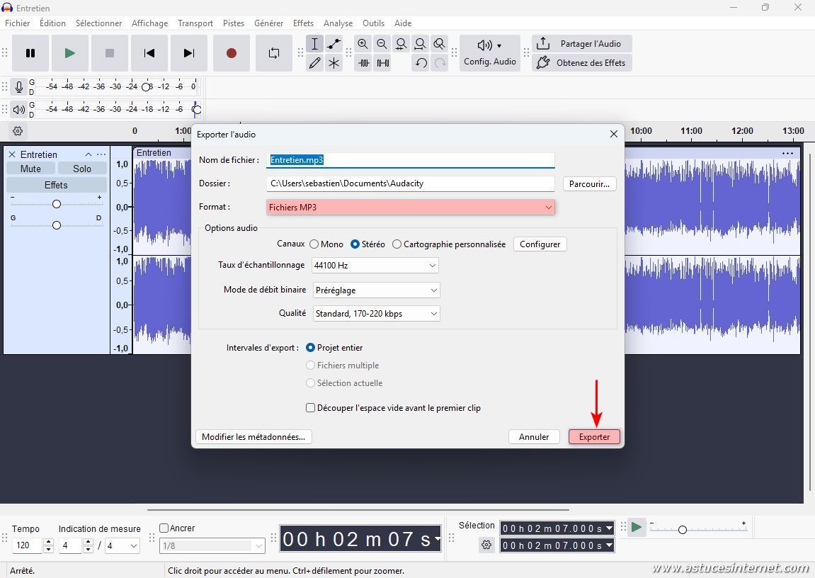 Dans la barre de menu, cliquez sur Fichier > Exporter l’audio.