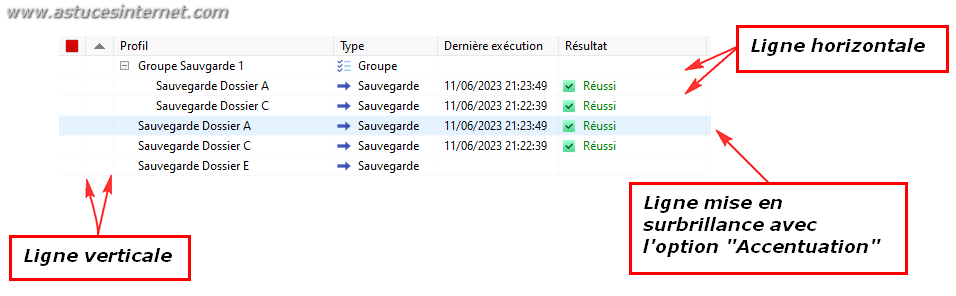 - Lignes Horizontales : Permet d’afficher des lignes horizontales dans la zone principale afin de faciliter la lecture du tableau contenant vos profils de sauvegarde.
