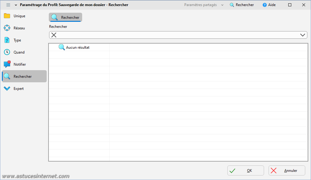 Par exemple : Saisissez le mot « Planification » et SyncBack vous proposera de consulter l’onglet « Quand » qui permet de paramétrer les planifications de profils de sauvegarde.